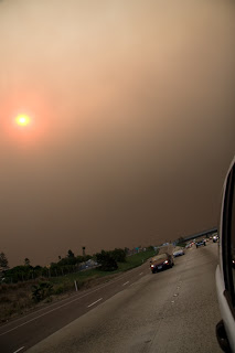 greg went off to work around 8 and we watched the news on TV- 7 fires, 300,000 acres burned, 250,000 evacuated from their homes. greg called and said one side of palomar airport road was sunny blue skies and the other was pitch black smoke. he was sent home from work by 9. i went the studio in solana beach to cancel appointments for the day after my dad and demi headed to LA. as i pulled into my studio parking lot it looked like it was snowing ash. the smoke was blocking out the sun and it was super dark and eerie. the lines at the gas stations reminded me like september 11th and all of the street lights were out.